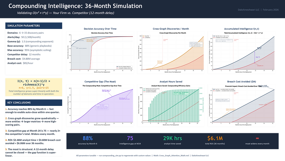 This paper draws on the mathematical framework formalized in Cross-Graph Attention: Mathematical Foundation, which provides the complete derivation with shape-checked equations, worked examples, and LLM judge review. Four controlled experiments validate the framework: scoring matrix convergence (69.4% accuracy), cross-graph discovery (110× above random), super-quadratic scaling (b = 2.30, R² = 0.9995), and sensitivity analysis with phase transitions. The SOC Copilot demo — a working proof-of-concept — demonstrates Clocks 1-3 in production.