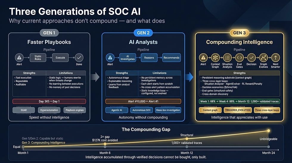 These failure modes are invisible to systems that don't learn from their own decisions. If your AI SOC tool processes each alert from scratch, it never encounters action confusion, oscillation, or the treadmill effect — because it never accumulates weights in the first place. These are problems only compounding systems have. And knowing them is the price of admission to Generation 3.