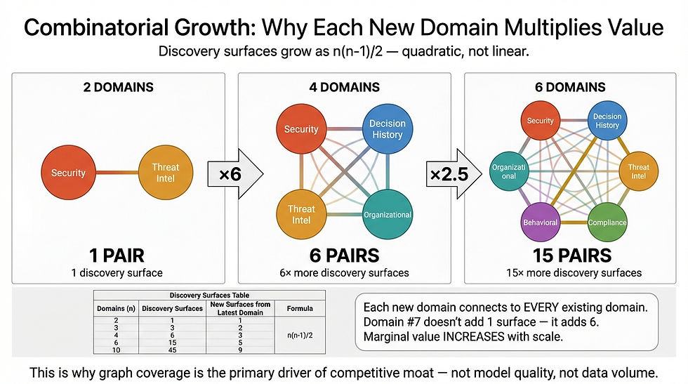 This is the mathematical structure of compounding applied to institutional knowledge. It's not a linear advantage that competitors can close by running faster. It's a super-linear advantage that accelerates with every month of operation and every domain connected.